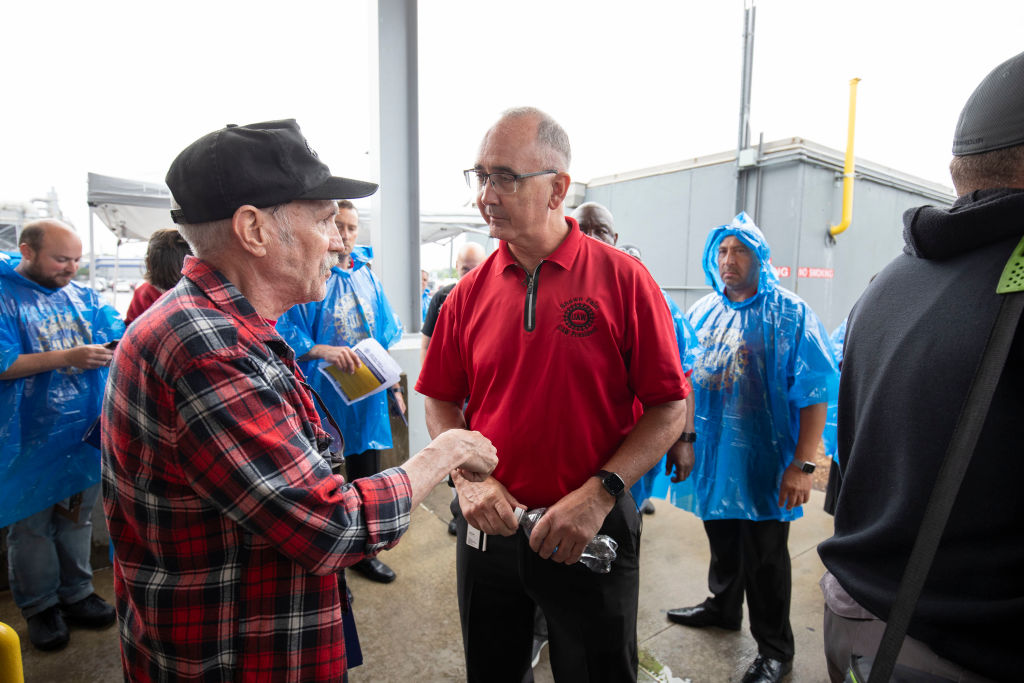 UAW president Shawn Fain speaks with workers at the Ford Michigan Assembly Plant on July 12, 2023 in Wayne, Michigan. (Bill Pugliano / Getty Images)