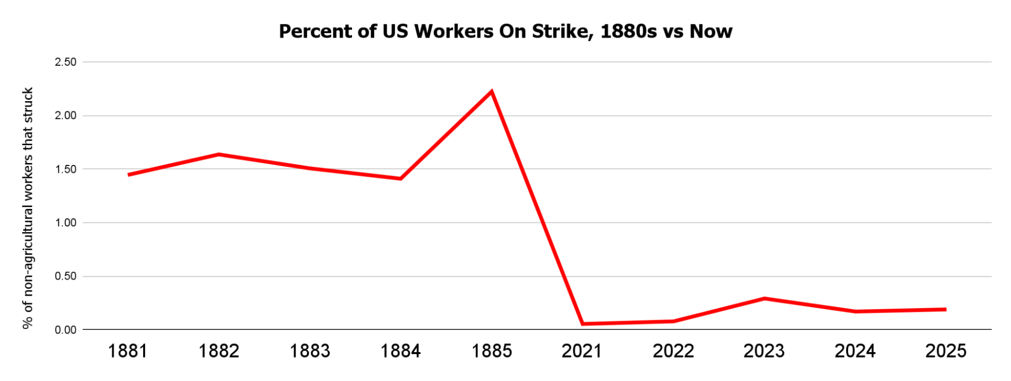 Some have pointed to the 1886 May Day strikes — the call for which came two years earlier, in 1884 — as an example showing that projecting a general strike date way ahead of time can inspire people and give enough time to build up. But there are two major reasons this analogy is off. First, strike momentum was much, much higher in 1884 than it is today, as you can see in the following graph.