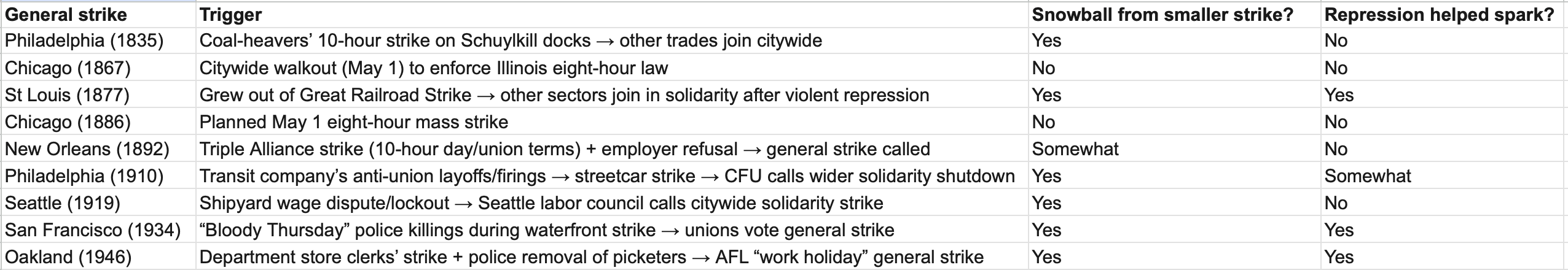 The need for strong momentum cuts against the suggestion of some seasoned US labor organizers that you can bring about a general strike simply by scaling up traditional strike preparation tactics like having one-on-one conversations with all your coworkers and launching escalating supermajority “structure tests” to measure support. Almost every general strike in US history has been sparked by a much smaller labor struggle whose dynamism, popularity, and confrontations with authorities generate enough momentum for large numbers of other workers to suddenly jump in to show solidarity (see table 1 below).